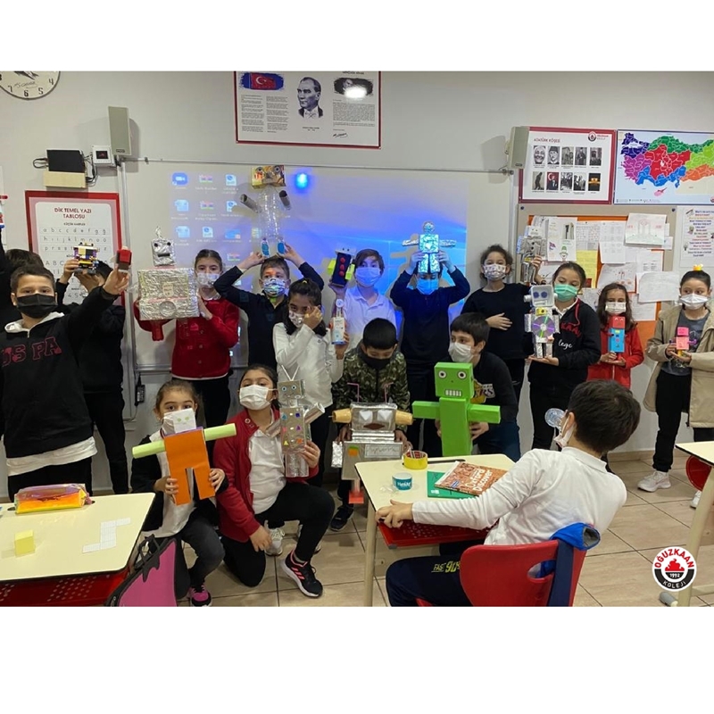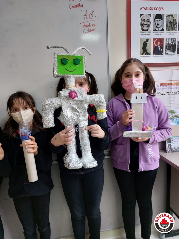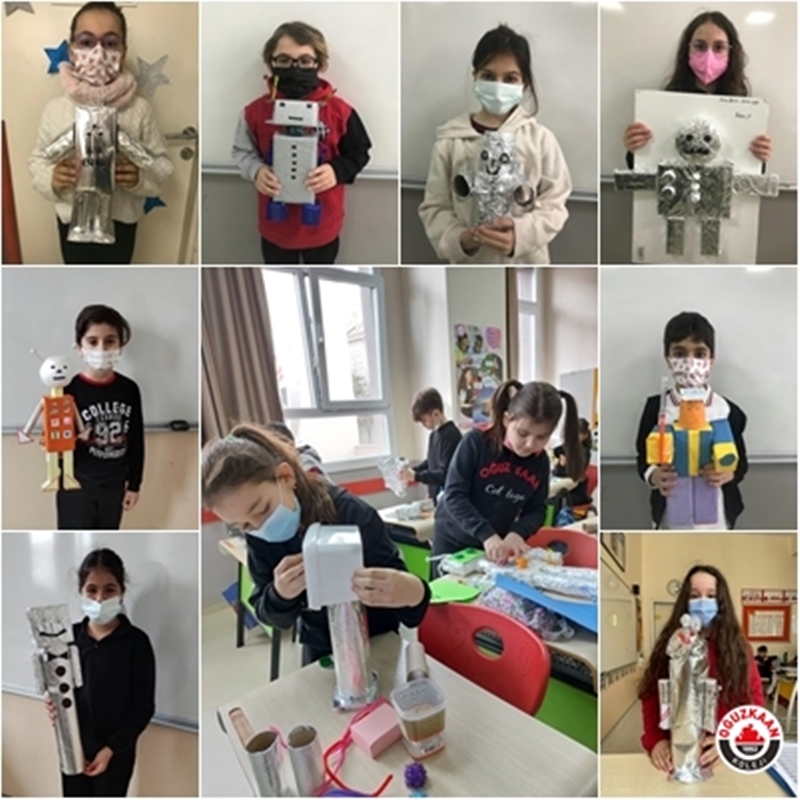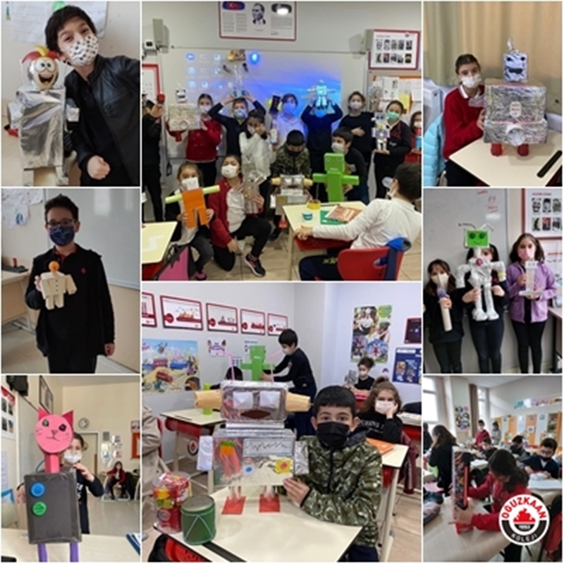 İlkokul 4. Sınıf öğrencilerimiz geometrik cisimlerden kendi robotlarını yaptılar ve sergilediler. Yaptıkları robotların detaylarını arkadaşlarına bir sunum yaparak anlattılar.